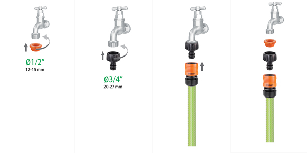 Tương thích với hai kích thước vòi nước, 3/4″ (27mm) hoặc 1/2″ (21mm).