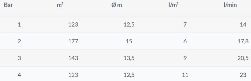Theo đó, Vòi phun Idrospray 2000 có thể hoạt động với nhiều áp lực nước khác nhau. Bạn có thể tham khảo bảng thông số chi tiết sau: