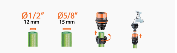 Khớp nối nhanh tự động cho ống mềm đường kính 1/2″ (12 – 17 mm) và 5/8″ (14 – 19 mm). Có đai bao cao su đặc biệt giúp việc cầm nắm trở nên dễ dàng. Không bị đau tay khi lắp đặt hệ thống tưới nước. Dù tay đang ướt cũng không bị trượt.
